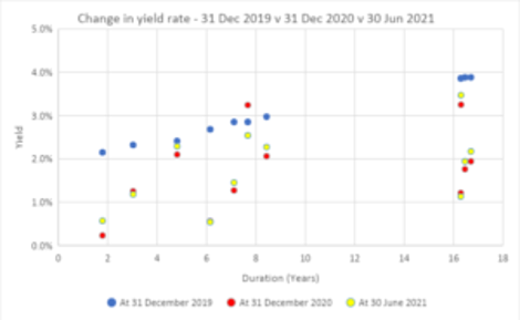 This scatter graph shows that, as at 31 December 2019, yield rates acted as expected by increasing with the length of the duration. However, the situation as at 31 December 2020 and 30 June 2021 is very different and demonstrates the volatility of the Bond markets at these two dates. Furthermore, for almost all durations, yields have markedly declined since 2019.