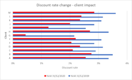 Graph 2 above is based on a cross-section of Lux’s IAS 19 clients whose duration of the liabilities has not changed by any more than +/- 0.3 years between 31 December 2019 and 31 December 2020.